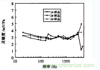 (1)采用均勻聲腔硅油介質中傳播的聲波作為壓力源,用比較法比較標準傳感器和被測傳感器的輸出,可有效地測量壓電式微壓傳感器的靈敏度及頻率響應特性。3只傳感器的測量靈敏度分別為3.05,2.98,2.98mV/Pa,靈敏度波動小于0.5mV/Pa,頻率響應范圍為20~2000Hz。