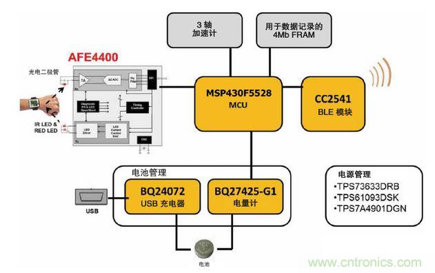 健康和健身電子裝置必須小巧、重量輕并且薄,這樣才能使他們易于佩帶或者組裝到便攜式配件中。這些電子器件還要在無需再次充電的情況下運轉很長時間,因為即使每天充電一次,用戶也會覺得比較麻煩。為了滿足這些要求,電子電路通常需要將高級感測和信號調節組合到全集成模擬前端 (AFE),以實現系統優化。如果需要其他數據處理能力,功耗極低的微控制器 (MCU) 可以存儲算法并且執行必要的計算。這些系統經常需要無線通信,這樣的話,智能手機或其他器件可以訪問或顯示信息,并且將這些信息傳遞至醫療人員能夠訪問的中央系統。這些核心系統功能全都依賴于調節電池電量使用和存儲的電源管理器件。在某些情況下,其他IC可被用來調節來自佩帶人員體溫或運動的能量采集。