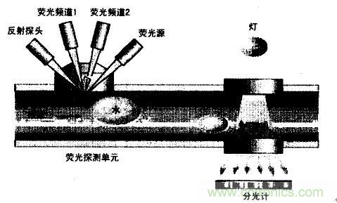 發光頻率為f的激光經透鏡,光纖被送到表皮組織。對于不動的組織,例如血管壁,所反射的光不產生頻移;而對于皮層毛細血管里流速為 的紅細胞,反射光要產生頻移,其頻率變化為△f;發生頻移的反射光強度與紅細胞的濃度成比例,頻率的變化值可與紅細胞的運動速度成正比。發射光經光纖收集后,先在光檢測器上進行混頻,然后進人信號處理儀,從而得到紅細胞的運動速度和濃度。