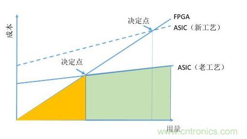 從上圖可以看出,F(xiàn)PGA由于沒有NRE,在用量較小的時(shí)候成本優(yōu)勢(shì)明顯。由于FPGA單個(gè)芯片成本高于ASIC,所以有較大斜率。在決定點(diǎn)位置以后,ASIC開始有成本優(yōu)勢(shì)。所以從成本因速考慮選用FPGA還是ASIC,與用量有很大關(guān)系。