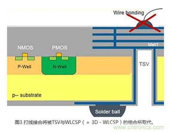 模擬3DIC技術(shù)通常是透過(guò)建造芯片正面到IC背面的電氣連接來(lái)實(shí)現(xiàn)傳感器應(yīng)用。 在許多傳感器應(yīng)用,例如光學(xué)、化學(xué)、氣體或壓力傳感器中,感測(cè)區(qū)域是位在CMOS側(cè)(晶圓的頂端)。 芯片和導(dǎo)線架之間最常用的連接是打線接合(Wire bonding)(圖1)。 無(wú)論是使用塑料封裝,或是將裸片直接接合在印刷電路(PCB)或軟性電路板上,對(duì)于某些會(huì)將感測(cè)區(qū)域暴露出來(lái)的應(yīng)用而言,打線接合并非理想的解決方案。 采用專業(yè)晶圓代工業(yè)者的專有TSV技術(shù),可以利用TSV、背面RDL和芯片級(jí)封裝(WLCSP)(圖2)來(lái)替代打線。