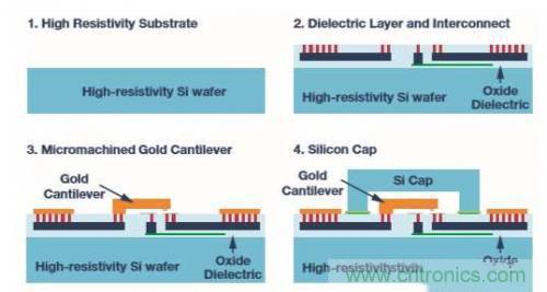圖二中所示為利用MEMS技術(shù)制造開關(guān)的四個(gè)主要步驟。 該開關(guān)是以高電阻率的硅芯片(具有沈積在頂部的厚電介質(zhì)層以提供與下方基板的優(yōu)越電氣隔離)所建構(gòu)。 使用了標(biāo)準(zhǔn)的后端CMOS內(nèi)部鏈接制程實(shí)現(xiàn)與MEMS開關(guān)的內(nèi)部鏈接。 低電阻率金屬與多晶硅都被用來制作與MEMS開關(guān)的電氣鏈接,而且都被嵌入至電介質(zhì)層當(dāng)中。