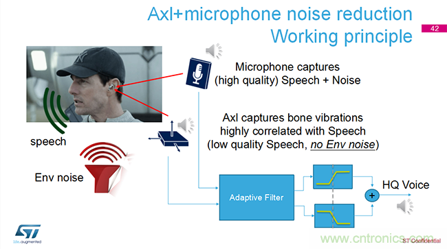 而LSM6DSR則是ST針對(duì)AI、VR應(yīng)用而推廣的高精度傳感器。另外一款新產(chǎn)品LSM6DST也將于今年推出,主要在功耗方面有所提升,面向耳機(jī)應(yīng)用。董愷補(bǔ)充道,“目前市面上的耳機(jī)都是雙麥設(shè)計(jì),ST則對(duì)麥克風(fēng)作了特別的設(shè)計(jì):在用戶單獨(dú)使用耳機(jī)時(shí),骨振動(dòng)傳感器只采集聲帶的振動(dòng)信息,再融合通過空氣傳播的聲音信息,對(duì)比分析出環(huán)境噪音并采取降噪措施,從而獲得高質(zhì)量的上行語(yǔ)音信號(hào)。這也是ST今年將重點(diǎn)推廣的器件。”