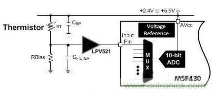 從技術(shù)上講,熱敏電阻是一種電阻器,它的電阻值隨溫度的變化而變化。如圖1中所示,需要一個(gè)偏置電路和少數(shù)幾個(gè)外部組件,在這里,偏置電阻器和熱敏電阻組成了一個(gè)分壓器,并且被接到一個(gè)可選運(yùn)算放大器上,這個(gè)運(yùn)算放大器與微控制器 (MCU) 的模數(shù)轉(zhuǎn)換器 (ADC) 相連,從而將熱敏電阻的電阻值轉(zhuǎn)換為一個(gè)溫度值。