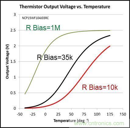 熱敏電阻的缺點(diǎn)是,只有在很窄的溫度范圍內(nèi),它的輸出才是線性和準(zhǔn)確的,而在這個(gè)范圍之外會(huì)變得非線性。圖2繪制了三條熱敏電阻的輸出曲線,偏置電阻分別為1MΩ、35kΩ和10kΩ。在窄溫度范圍內(nèi),每條曲線都是線性的,不過在偏置電阻分別為1MΩ、35kΩ和10kΩ,而溫度分別為10ºC、75ºC和50ºC以下時(shí),這三條曲線為非線性。雖然針對(duì)特定溫度,可以使用專門校準(zhǔn)的熱敏電阻來實(shí)現(xiàn)目標(biāo)精度,但是這種熱敏電阻成本較高,并且這三款不同的器件也使得庫存管理變得過于復(fù)雜。其它缺點(diǎn)還包括無法預(yù)計(jì)的故障、抗擾度低和功耗較高。