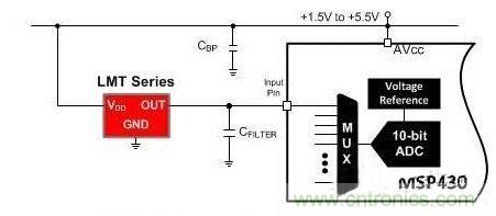 模擬溫度傳感器是一個(gè)有源半導(dǎo)體器件,它的輸出是與溫度成比例的電壓值或電流值。作為一個(gè)集成電路 (IC),模擬溫度傳感器具有熱敏電阻所不具備的內(nèi)置智能性,從而使與模擬溫度傳感器有關(guān)的設(shè)計(jì)工作變得簡(jiǎn)單。圖3顯示了其中一款TI LMT系列模擬溫度傳感器的典型應(yīng)用,在這個(gè)應(yīng)用中,只有IC,而未使用外部組件。