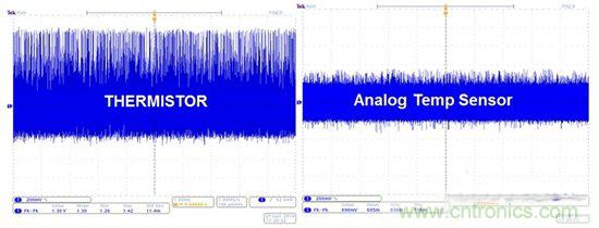 圖6:熱敏電阻與模擬溫度傳感器在連接到開關(guān)穩(wěn)壓器時(shí)的噪聲實(shí)驗(yàn)