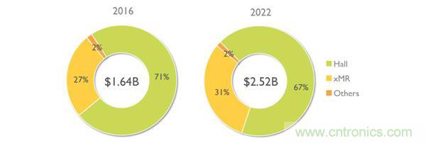 2016年和2022年按技術(shù)分類的磁傳感器市場(chǎng)份額