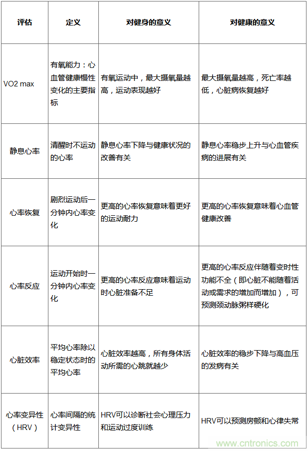 【導讀】在日益數(shù)字化的世界中,光學心率傳感器在可穿戴設(shè)備中的應用越來越廣泛。這些設(shè)備中數(shù)不清的應用可提供從個人活動、健身水平到健康狀況的所有內(nèi)容。精準的生物識別傳感器數(shù)據(jù)可以提供準確的健身/健康評估,但設(shè)計師和工程師究竟能用這些評估做些什么呢?表1總結(jié)了目前在健身應用中使用的一些常見評估,這些評估也證明了健康醫(yī)療的意義。