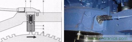 1、永磁鐵 2、傳感器殼體 3、發動機外蓋 4、軟鐵芯 5、線圈 6、傳感線圈