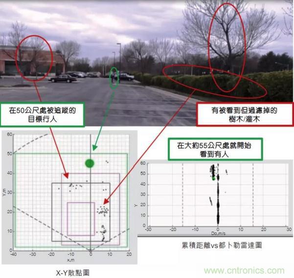 圖1顯示了在一項安防應用中,使用芯片上智能算法在50公尺室外入侵探測器的一項實驗結果。入侵探測器用于確定是否有人進入受保護區域,例如貨運場、停車場或后院。一些仰賴光學或紅外線感測的探測器,可能會檢測到附近樹木和灌木的錯誤運動。而毫米波傳感器使用處理和算法來濾除和防止錯誤的檢測,僅在人體運動時觸發探測器。安防攝影機和可視門鈴(video doorbells)可以通過聯網服務器處理圖像信息,執行相同的錯誤檢測過濾;但這些基于服務器的系統所提供的功能通常需要使用者付費,毫米波技術則可實現在傳感器本身進行決策,無需聯網服務器。