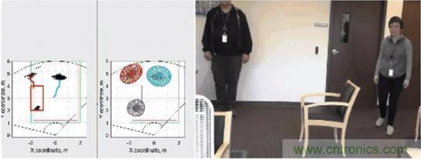 圖4:使用毫米波傳感器執行分類的范例:中間圖上所有移動目標都分配了一個軌道,其中的每個彩色區域代表一個人