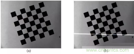 圖像的獲取是在攝機參數(shù)標定過程中同時完成。 首先將棋盤格放在工作臺上, 在這個初始位置,利用攝像機采集一幅圖,如圖 (a) 所示 。保持攝像機和棋盤格的位置姿態(tài)不變,打開激光器讓條紋投射到棋盤格上, 再采集一幅圖像如圖 (b) 所示: