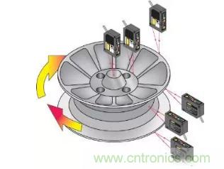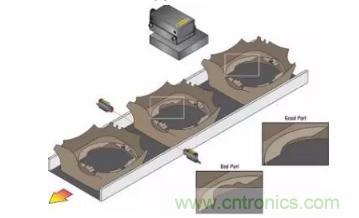隨著過去幾年傳感技術的進步,用戶現在能夠將具有成本效益的測量功能集成到他們的工藝中,分辨率高達0.0001英寸。在下一個制造步驟之前,可以自動檢查零件的關鍵屬性。在圖示中,激光傳感器檢查在夾具中旋轉的鑄造輪,以確保在加工之前沒有空隙或過多的跳動。