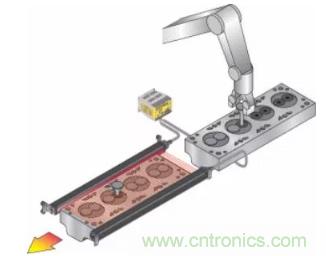 在流程的下一步驟之前驗證關鍵部件是否到位并處于正確位置是一項常見要求。光電傳感器可以輕松實現這一目標,最新型號甚至可以檢測零件的最小和最窄邊緣。在圖示中,兩個傳感器可以形成僅為百分之一英寸的會聚點,以精確地檢測半導體晶片的邊緣。在該示例中,傳感器不僅驗證晶片的存在,而且還可以檢測晶片是否在盒中傾斜。