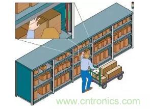 順序手動裝配中人的準確性也是防錯的一個大問題。PLC控制的“揀選”系統使用指示下一個要選擇的項目的燈,以及每個箱前面的光幕來驗證是否已經采取了正確的部件。這些系統通過減少錯過的零件以及以錯誤順序組裝的零件來提高裝配操作的質量百分比。除了裝配過程的防錯之外,它們還通過在裝配過程中始終驗證裝配工最后停止的位置來提高工人效率,即使在休息或停工之后也是如此。這種完全可視化的通信系統也是一種全球解決方案,可消除語言障礙和技術能力等培訓障礙。該圖顯示了倉庫應用程序。