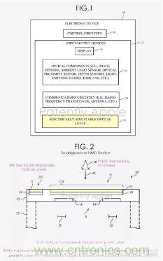 蘋果公司希望通過此專利推進其在可調節光學層上的技術發展。此發明支持使用者對智能眼鏡的光學層進行模式調節,例如按照個人喜好調整光學層的明暗。下圖1是具有光學組件和電可調光學層的電子設備示意圖;下圖2是頭戴式設備采用電可調光學層(#8)的示意圖。