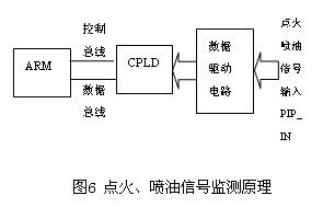 點(diǎn)火和噴油信號(hào)是汽車發(fā)動(dòng)機(jī)中的關(guān)鍵信號(hào),其周期和時(shí)序直接關(guān)系到汽車的運(yùn)行狀態(tài),因此監(jiān)測(cè)它們的周期和時(shí)序尤為重要。本系統(tǒng)監(jiān)測(cè)原理圖如圖6 所示,對(duì)于點(diǎn)火信號(hào)的監(jiān)測(cè),主要是監(jiān)測(cè)它與CPS信號(hào)的同步,以及兩個(gè)或四個(gè)點(diǎn)火信號(hào)之間的時(shí)序關(guān)系。當(dāng)CPLD尋找到點(diǎn)火信號(hào)與CPS同步的起始點(diǎn)后,根據(jù)輸入的PIP_IN信號(hào),對(duì)各點(diǎn)火信號(hào)進(jìn)行計(jì)數(shù)。每當(dāng)一個(gè)點(diǎn)火周期完成后,在下一個(gè)點(diǎn)火周期向ARM 單片機(jī)產(chǎn)生一個(gè)中斷信號(hào)。該中斷信號(hào)觸發(fā)ARM 單片機(jī)進(jìn)入中斷處理程序,在該中斷程序中,ARM單片機(jī)讀入對(duì)各點(diǎn)火信號(hào)的計(jì)數(shù)值,判斷點(diǎn)火信號(hào)的時(shí)序和周期,并設(shè)置點(diǎn)火信號(hào)正常與否的標(biāo)志。對(duì)于噴油信號(hào)的監(jiān)測(cè),主要是監(jiān)測(cè)它與CPS信號(hào)的同步,以及它們之間的時(shí)序關(guān)系。當(dāng)PIP_IN信號(hào)中四個(gè)噴油信號(hào)中任何一個(gè)信號(hào)的下降沿到來(lái)時(shí),CPLD都會(huì)監(jiān)測(cè)其它三個(gè)噴油信號(hào)的狀態(tài),如果其它三個(gè)噴油信號(hào)的狀態(tài)正常,即給出噴油信號(hào)正常標(biāo)志,反之給出噴油信號(hào)異常標(biāo)志。